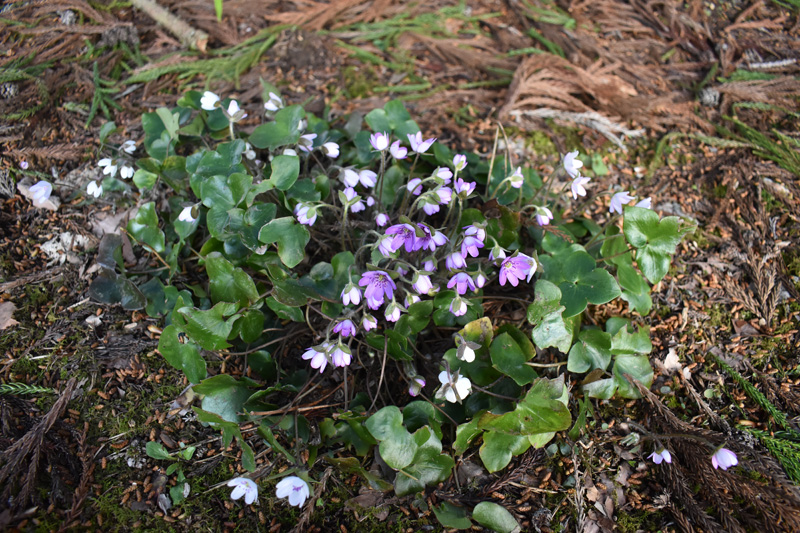 杉林の中に植えた雪割草の花が満開できれいでした。