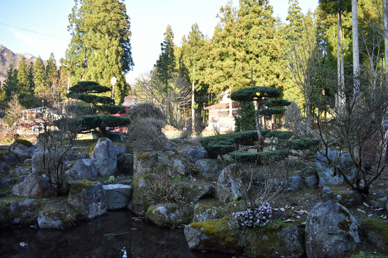 昨日、庭木の雪囲いを外した池の脇に