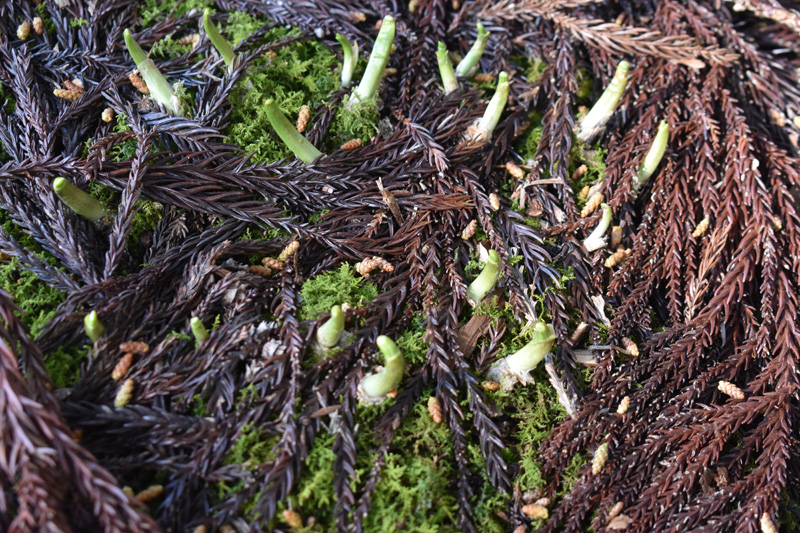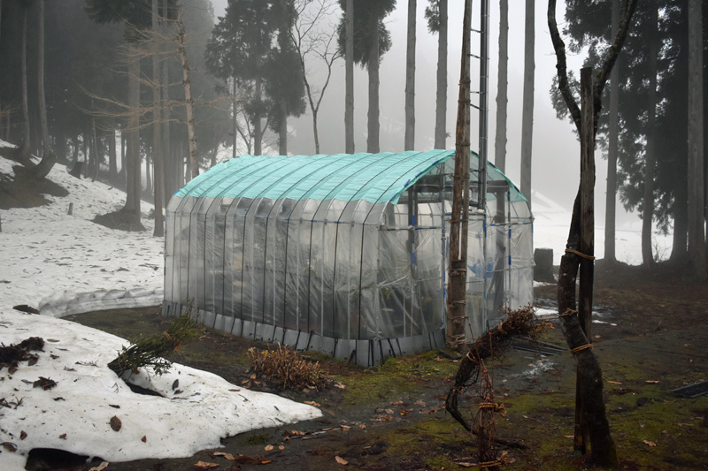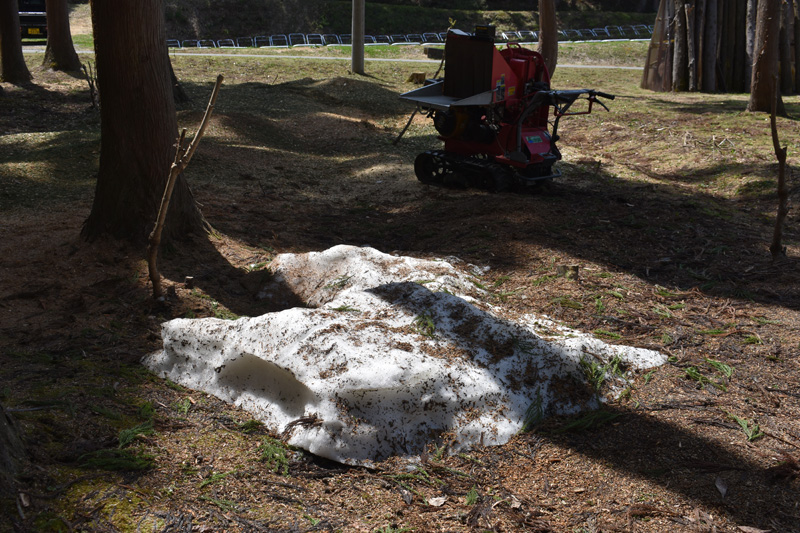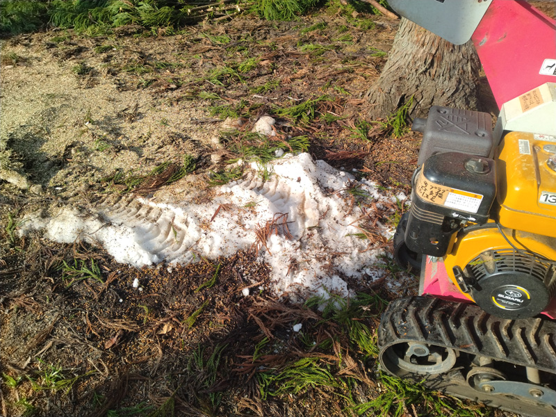 落とした杉の枝葉の下には雪が残っていました。