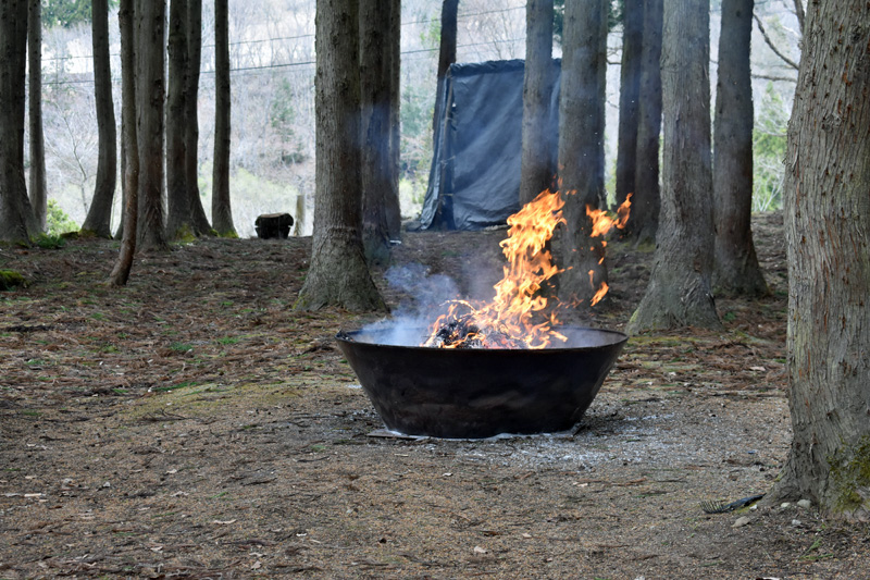 休憩所に落ちた杉の枯れ葉の焼却に