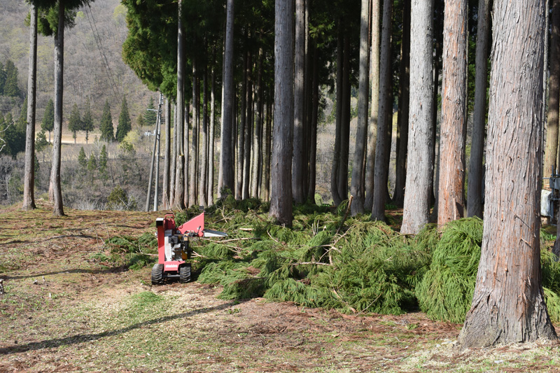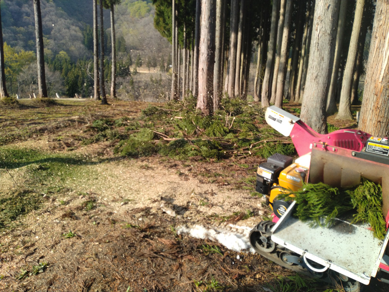 枝打ちした杉葉のチッパー化