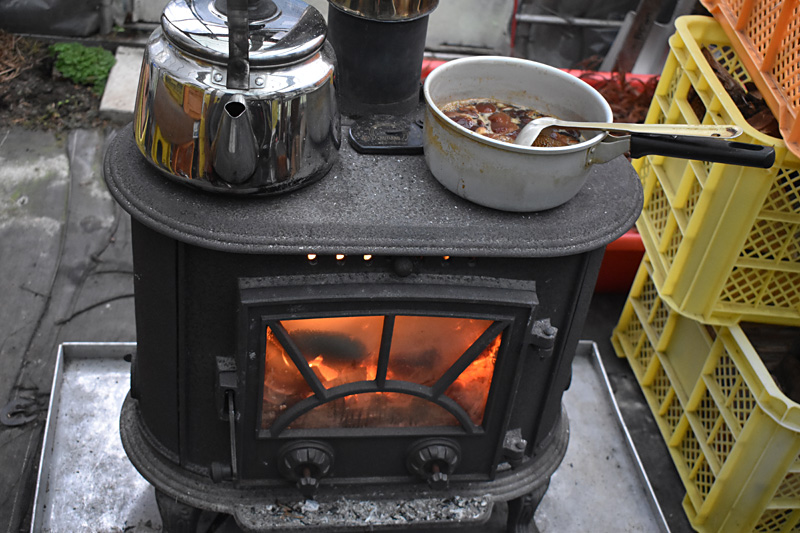 冷凍のモツを購入して来て、薪ストーブでモツ煮を