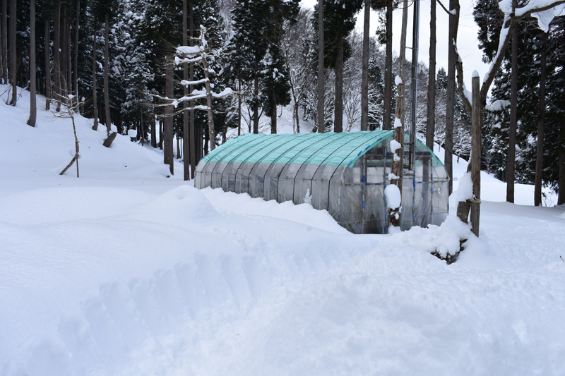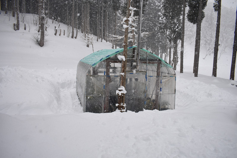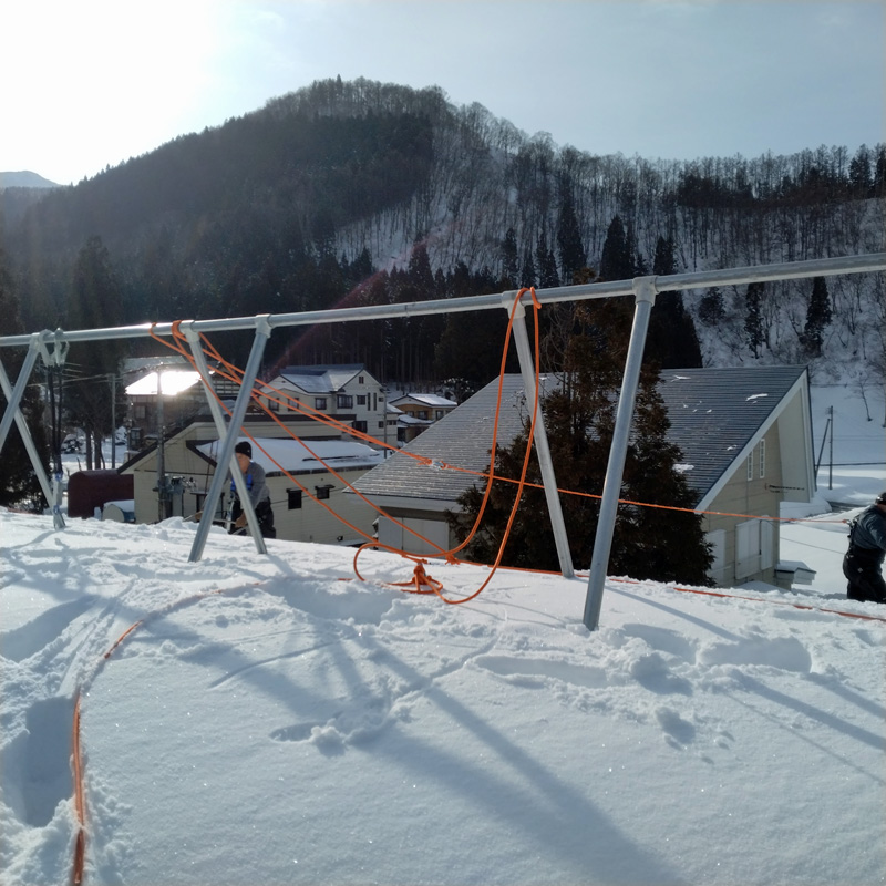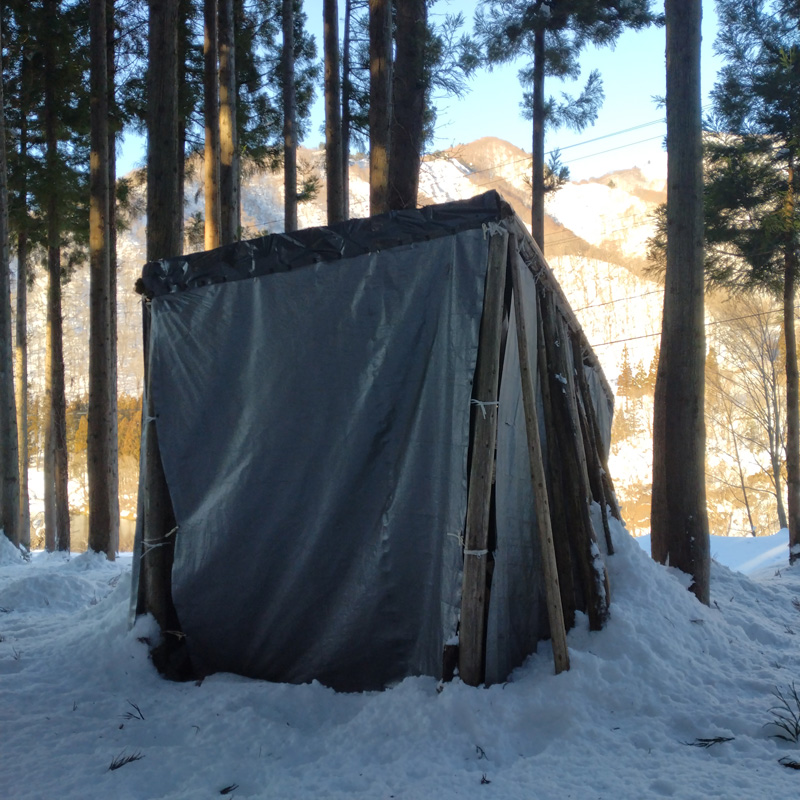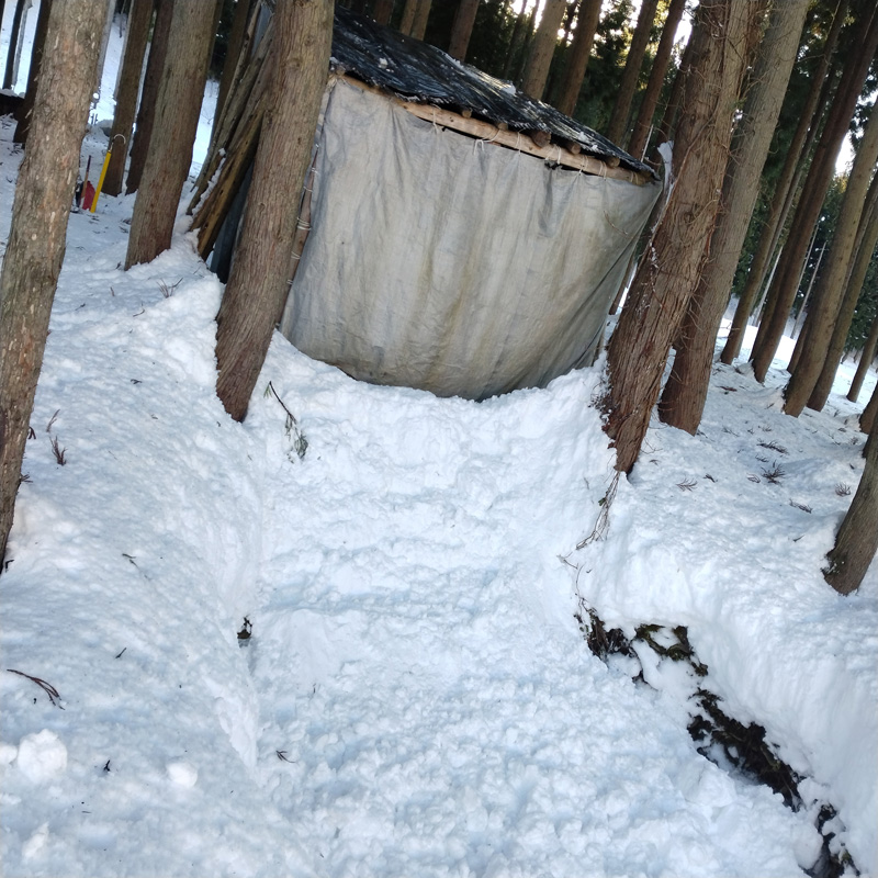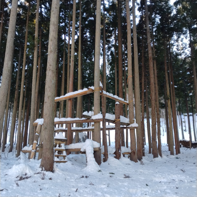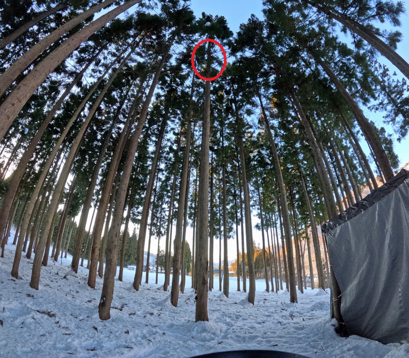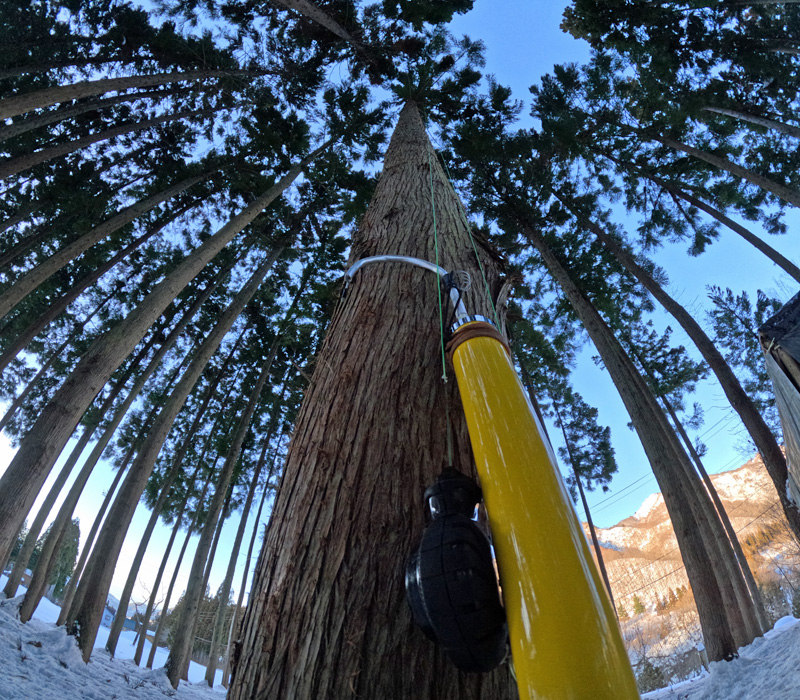 次回の雪堀りの為に小屋の前の杉にスローライン
