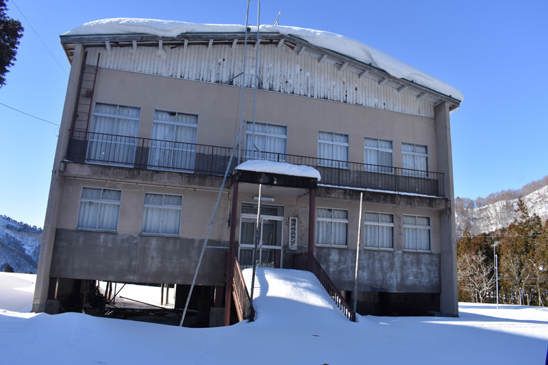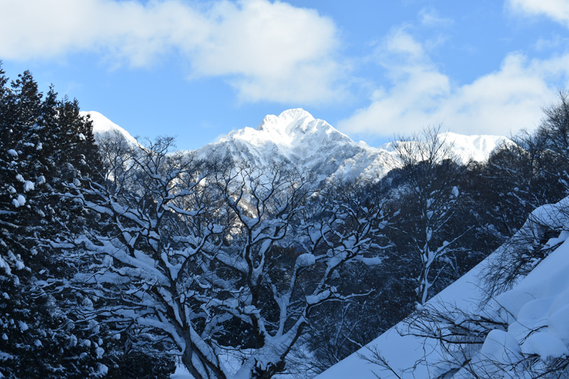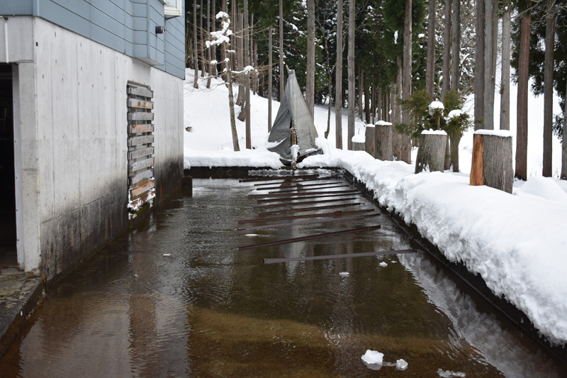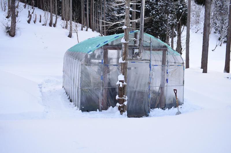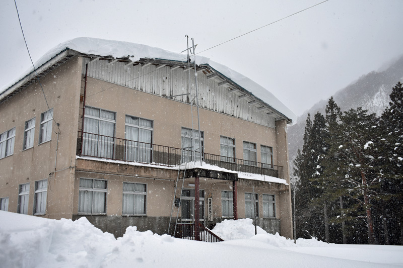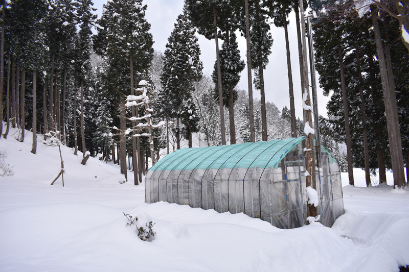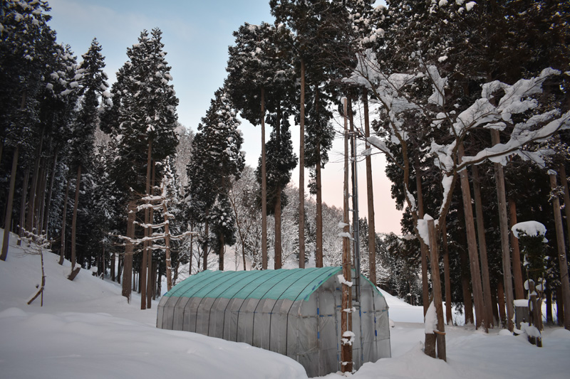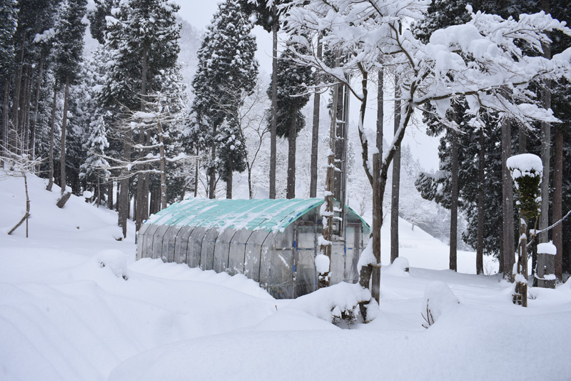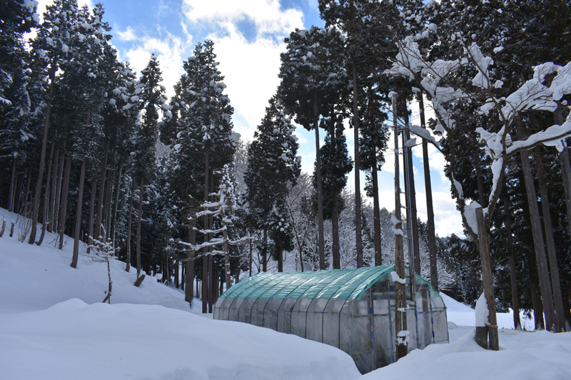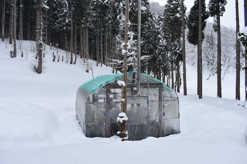 次回の雪堀りの為に小屋の前の杉にスローライン