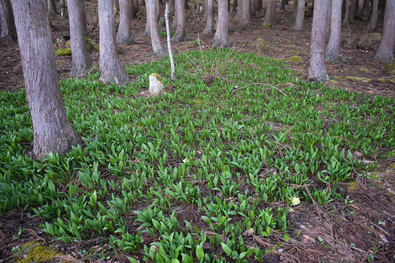 雪が真っ先に消えたとことは行者ニンニクが青々