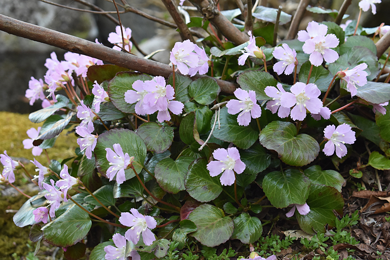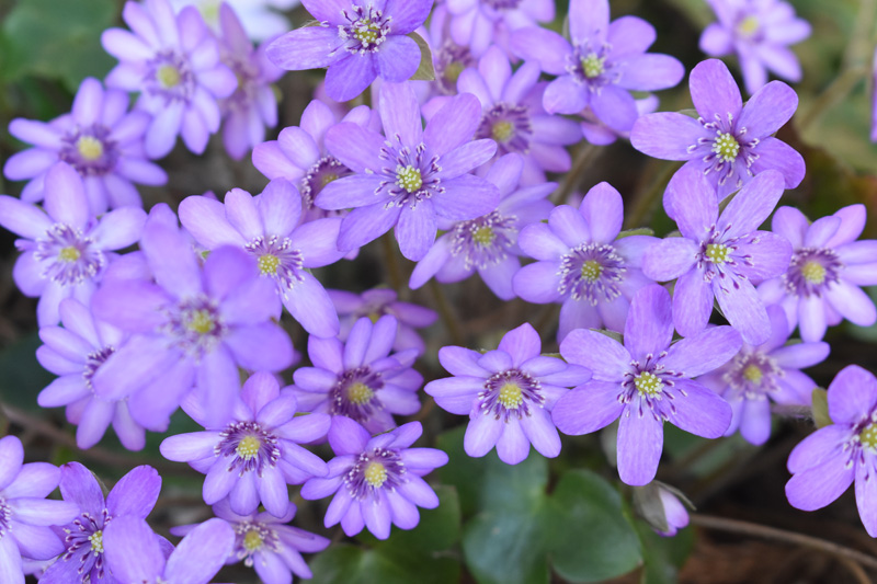 上の杉林に咲いた雪割草の花が満開で