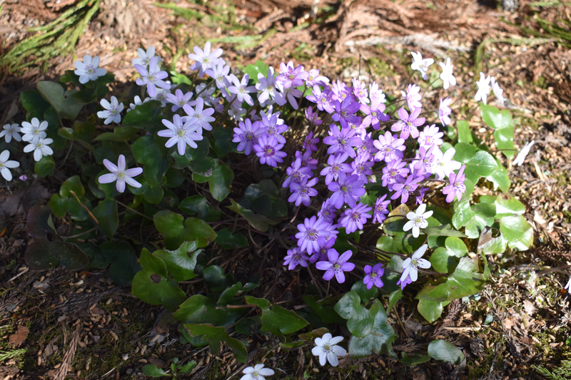 杉林の中に植えた雪割草の花が満開できれいでした。