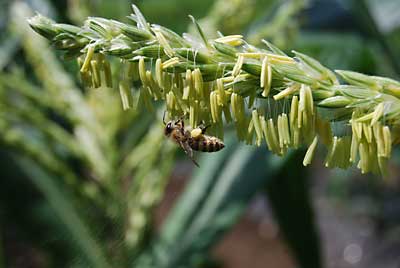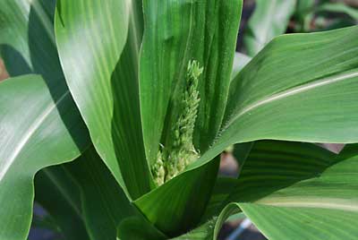 スイートコーン「雪の妖精」は、雄花の花粉が飛び始めました。