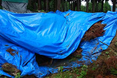 午前中、台風のためたたんでおいたブルーシートを張り直しました。