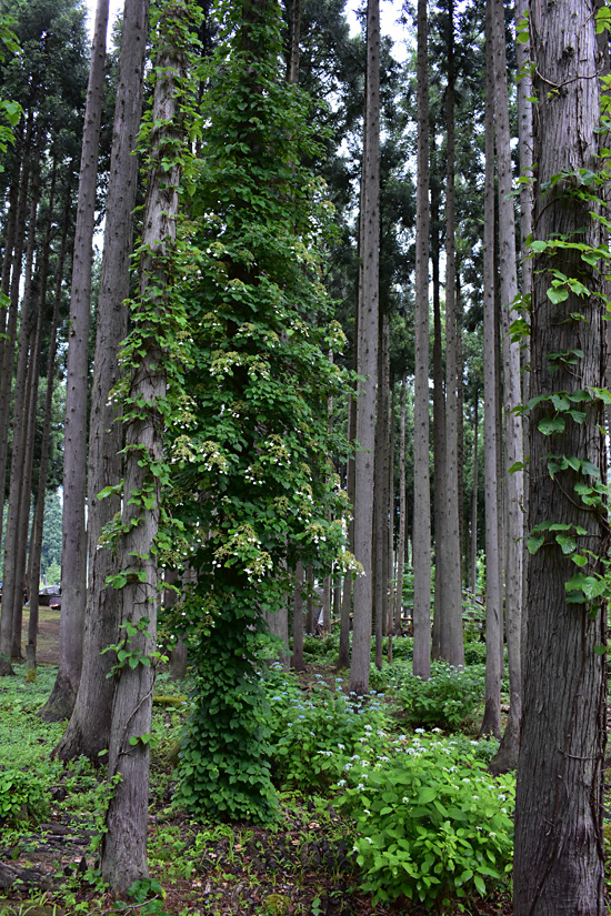 杉の幹に巻き付いたツルアジサイが