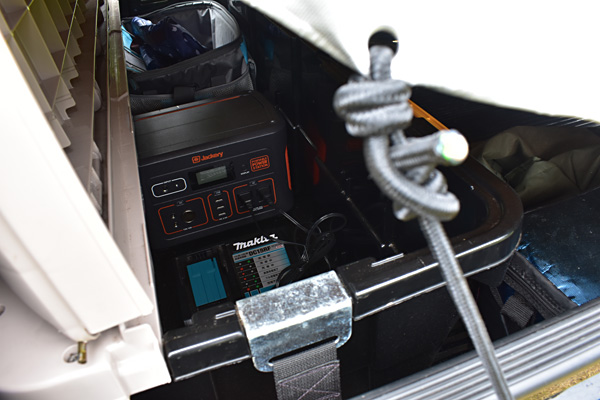 交換用のバッテリー(18V×6個)とポータブル電源が