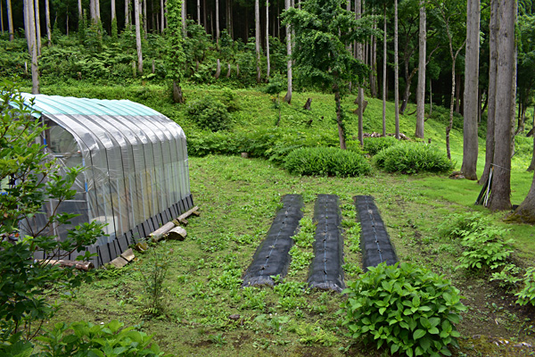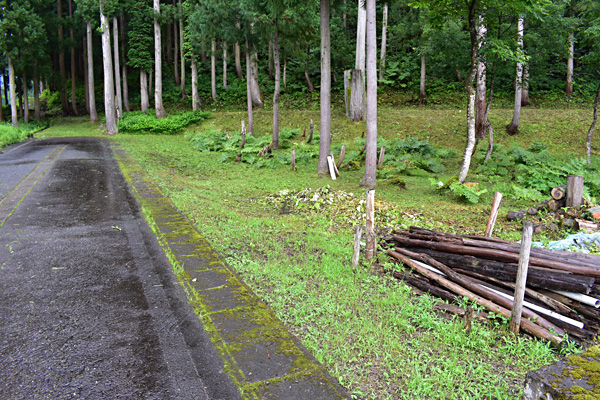 農園のメインの杉林の周りの道路とナメコのホダ木を