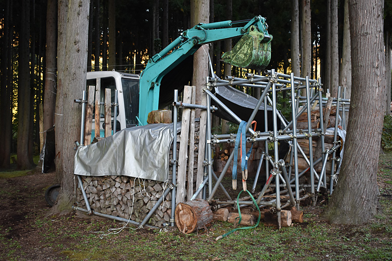 夕方前に上の杉林の薪棚をユンボ君に頑張ってもらい