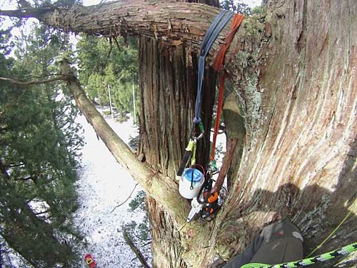 トップアンカーを設置するためにツヨロンの木登り器を持って