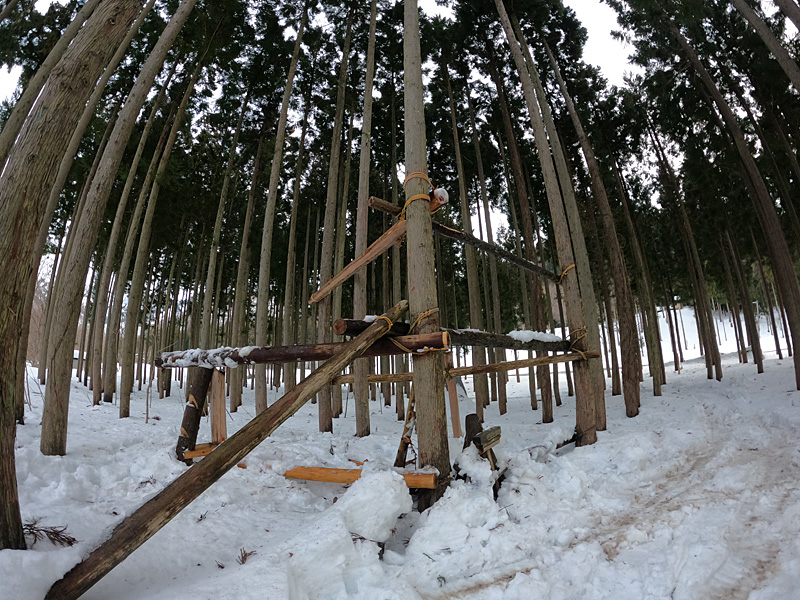 先日、登る杉の脇に横木を設置したので