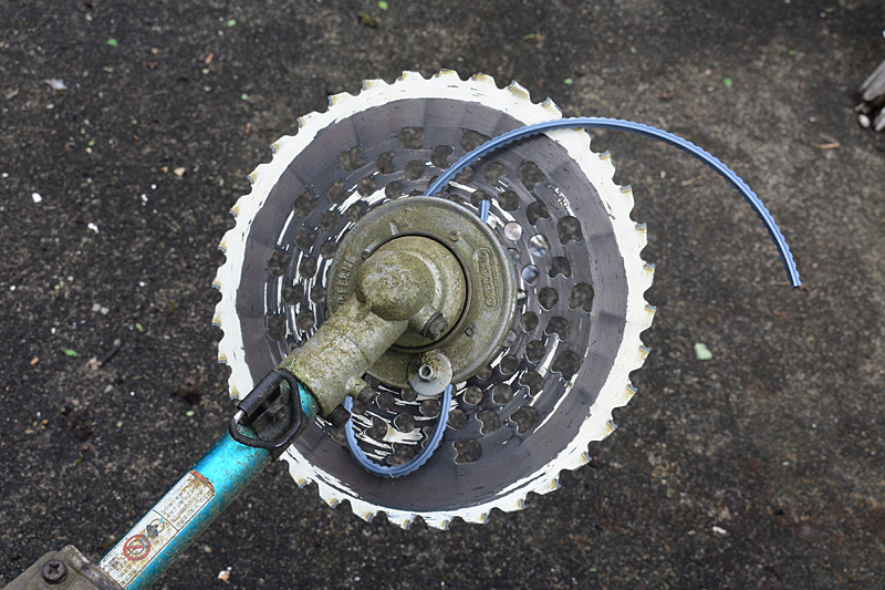 大きい草をチップソーで刈ってから、最後はヒモ刃で