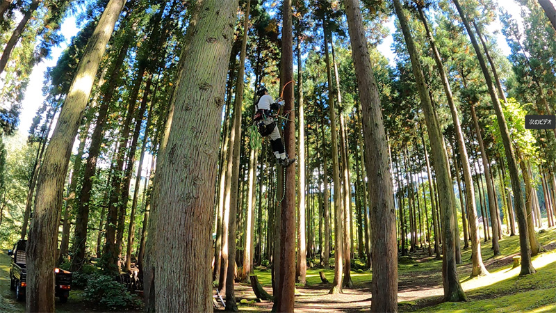 スパイクレス枝打ちシステム2で枝打ちの